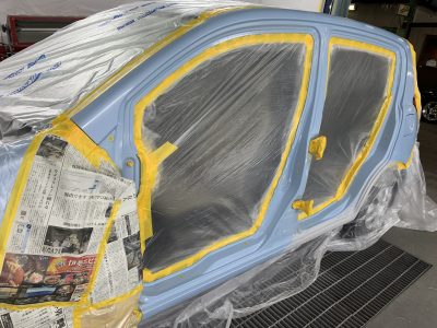 サフの研磨が終わるとマスキング作業です。これは、塗料をかけたくない部分、つまり窓やドアの内側、車体の他のパネルなどを、新聞紙や専用のマスキングシートで厳重に覆い隠す作業です。